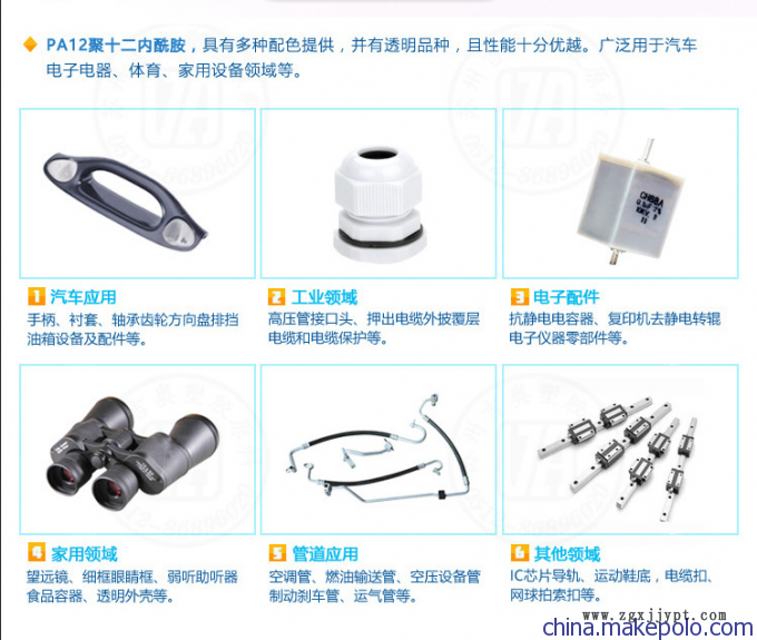 工程塑膠原料:PC、PC/ABS、ABS+PC、PPO、PPE、PPE+PS、PPO+PA、PA+ABS、ABS/PA、POM、PA6、PA66、PA46、PA9T、PA6T、PA12、PA11、PA6/66、PBT、PET、ASA、AES、PC+PBT、CA等。