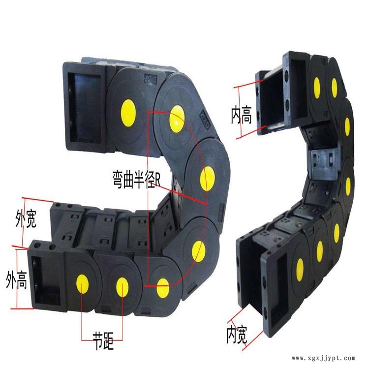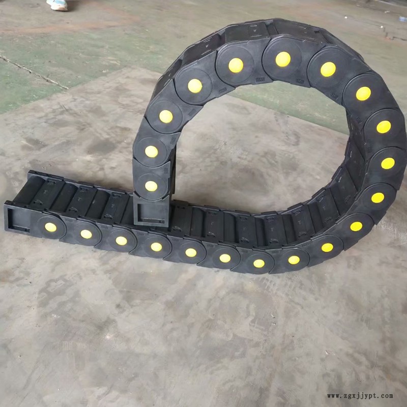 紡織機械用塑料拖鏈 切割機用尼龍拖鏈廠家拖鏈用途和特點:1、拖鏈每節(jié)都能打開,便于安裝和維修,運動的噪音低、可高速運動。2、拖鏈已被應(yīng)用于數(shù)控機床、電子設(shè)備、石材機械、玻璃機械、門窗機械、注塑機、機械手、起重運輸設(shè)備、自動化倉庫等。3、拖鏈外形似坦克鏈,由眾多單元鏈節(jié)組成,鏈節(jié)之間轉(zhuǎn)動自如。4、相同系列的拖鏈內(nèi)高、外高、節(jié)距相同,拖鏈內(nèi)高、彎曲半徑R可有不同的選擇。5、單元鏈節(jié)由左右鏈板和上下蓋板組成,拖鏈每節(jié)都能打開,裝拆方便、不必穿線,打開蓋板后即可把電纜、油管、氣管等放入拖鏈內(nèi)。