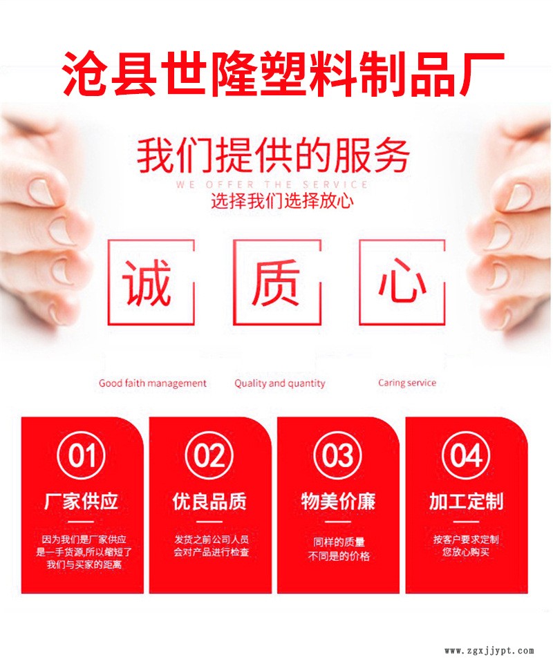 滄縣世隆塑料制品廠是生產(chǎn)銷售塑料制品等產(chǎn)品生產(chǎn)加工的公司,擁有完整、科學的質(zhì)量管理體系滄縣世隆塑料制品廠的誠信、實力和產(chǎn)品質(zhì)量獲得業(yè)界的認可。歡迎各界朋友蒞臨參觀、指導和業(yè)務洽談。 自公司成立以來,本著“質(zhì)量為先,服務為本”的經(jīng)營理念,服務于新老客戶,獲得新老客戶的 一致好評,現(xiàn)已擁有完整的線上線下銷售渠道,擁有完整、科學的質(zhì)量管理體系,所生產(chǎn)的產(chǎn)品銷往各國各地。始終堅持“誠信、品質(zhì)、創(chuàng)新、服務、速度”十字經(jīng)營方針, 對待客戶、合作伙伴堅持誠信為先,我們要為客戶不斷提供高品質(zhì)的產(chǎn)品和及時周到的服務,并不斷創(chuàng)新,提高我們的服務能力,在此基礎上不斷地優(yōu)化我們的組織結構和工作流程,使我們的企業(yè)健康成永續(xù)經(jīng)營。