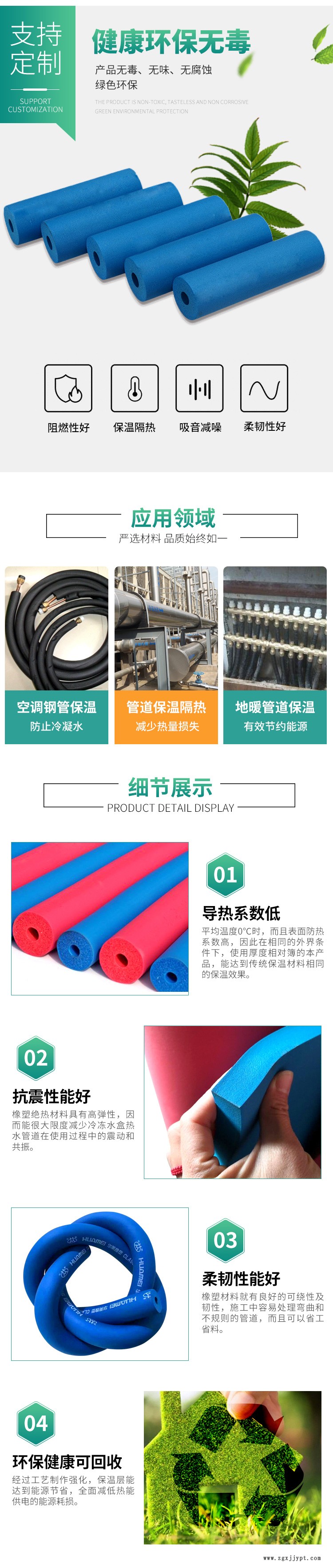 其它優(yōu)點 橡塑保溫管使用起來十分保險,既不會刺激皮膚,也不會危害健康。它們能防止酶菌生長,避免害蟲或老鼠嚙咬,而且耐酸抗堿,性能優(yōu)越。這些性能使華美橡塑成為保護管道的理想隔熱材料,防止它們因大氣介質(zhì)或工業(yè)環(huán)境而受到腐蝕。