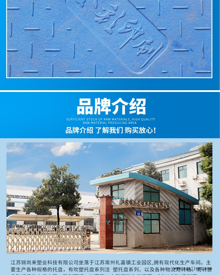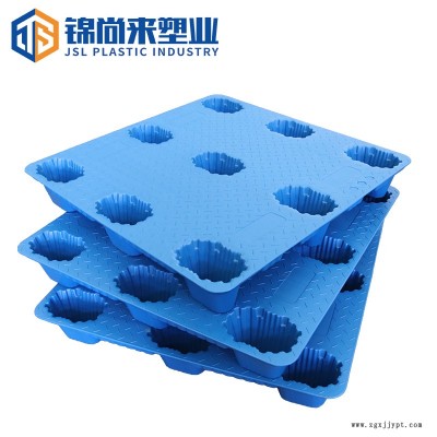 2、九腳吹塑托盤產品選用高分子量高密度聚乙烯樹脂,經擠出一次吹塑成型。成型過程快速、充分;產品成型飽滿,內在質量和性能穩(wěn)定。