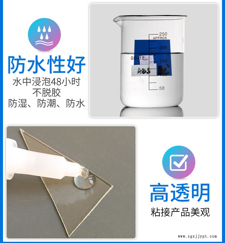 | 防水性好 : | 水中浸泡48小時(shí)不脫膠 | 透明無色 : | 粘接產(chǎn)品更美觀 |