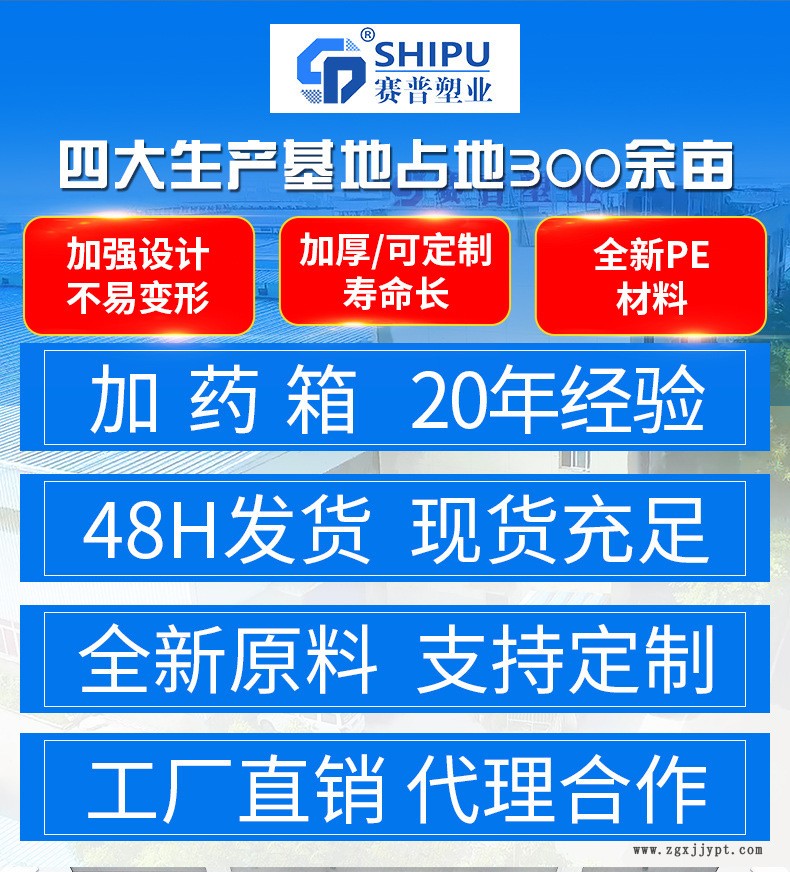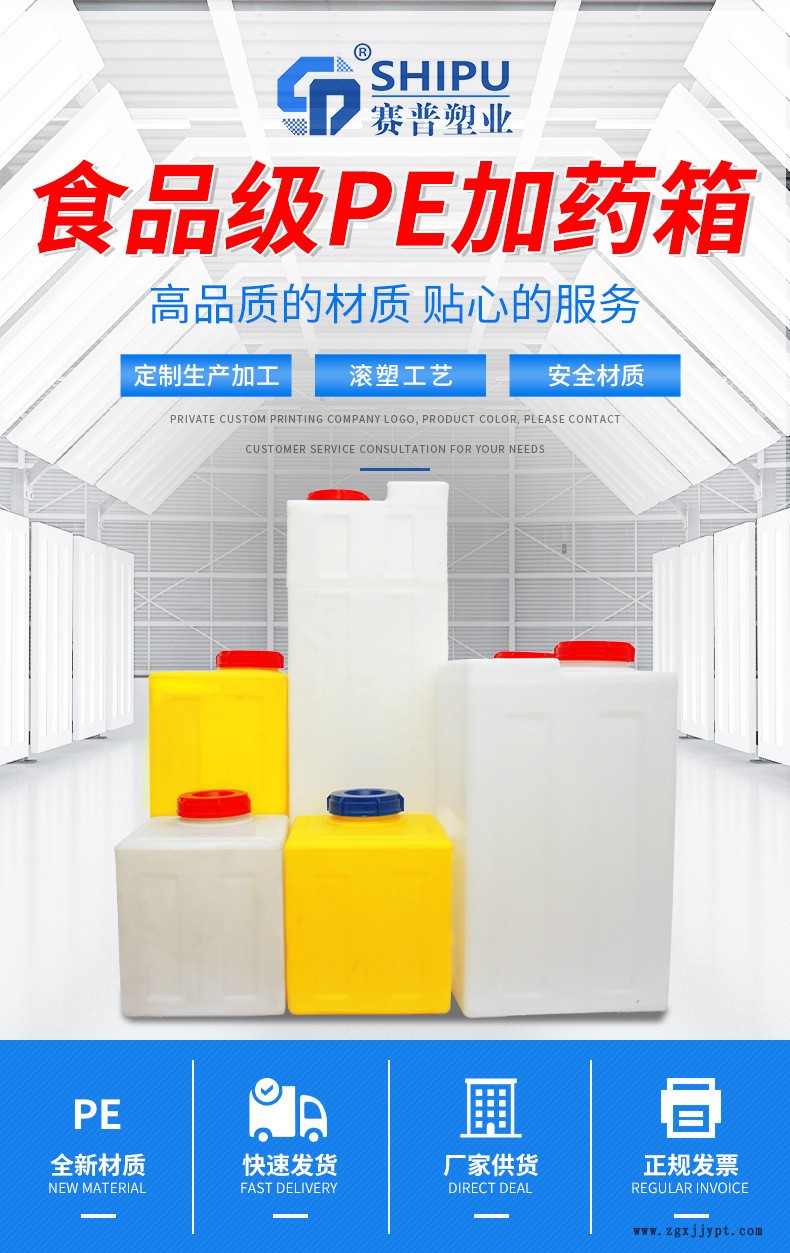 重慶市賽普塑料制品有限公司為您提供絮凝劑加藥箱、賽普加藥箱、加藥箱。 加藥箱加藥箱實(shí)地應(yīng)用pe根據(jù)所需藥劑濃度,在攪拌箱內(nèi)配制,經(jīng)攪拌器攪拌均勻后投入溶液箱、用計(jì)量泵加藥泵向投藥點(diǎn)的系統(tǒng)中輸送所配制的溶液。成套具有結(jié)構(gòu)緊湊、安全簡(jiǎn)單、操作使用簡(jiǎn)便等特點(diǎn)。該裝置還可根據(jù)用戶不同流程的要求,進(jìn)行有針對(duì)性的設(shè)計(jì)、配置必要的部件,pe加藥箱,實(shí)現(xiàn)功能適合如自動(dòng)遠(yuǎn)程控制、經(jīng)濟(jì)實(shí)用。 產(chǎn)品特點(diǎn): 1.原料:采用進(jìn)口lldpe,無味,不易老化。 2.工藝:采用滾塑一次成型,無縫無焊接。 3.適用:耐高溫80攝氏度耐冷凍—40攝氏度耐酸堿鹽。 4.來圖來樣定制。 5.適用于:高層建筑二次供水、蓄水水處理凈化設(shè)備配套工業(yè)用冷卻水化工制劑、化工原料、各種油品、飲品的儲(chǔ)存、運(yùn)輸,城鎮(zhèn),農(nóng)村、酒店,賓館,屋頂蓄水。