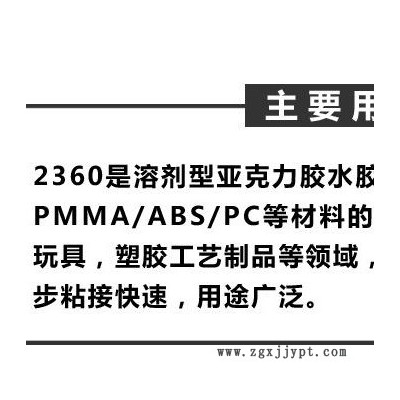 2360是溶劑型亞克力膠水膠粘劑,分別使用于PS/PMMA/ABS/PC等材料的粘接,主要應(yīng)用于塑膠玩具,塑膠工藝制品等領(lǐng)域,具有優(yōu)異之接著性,初步粘接快速,用途廣泛。