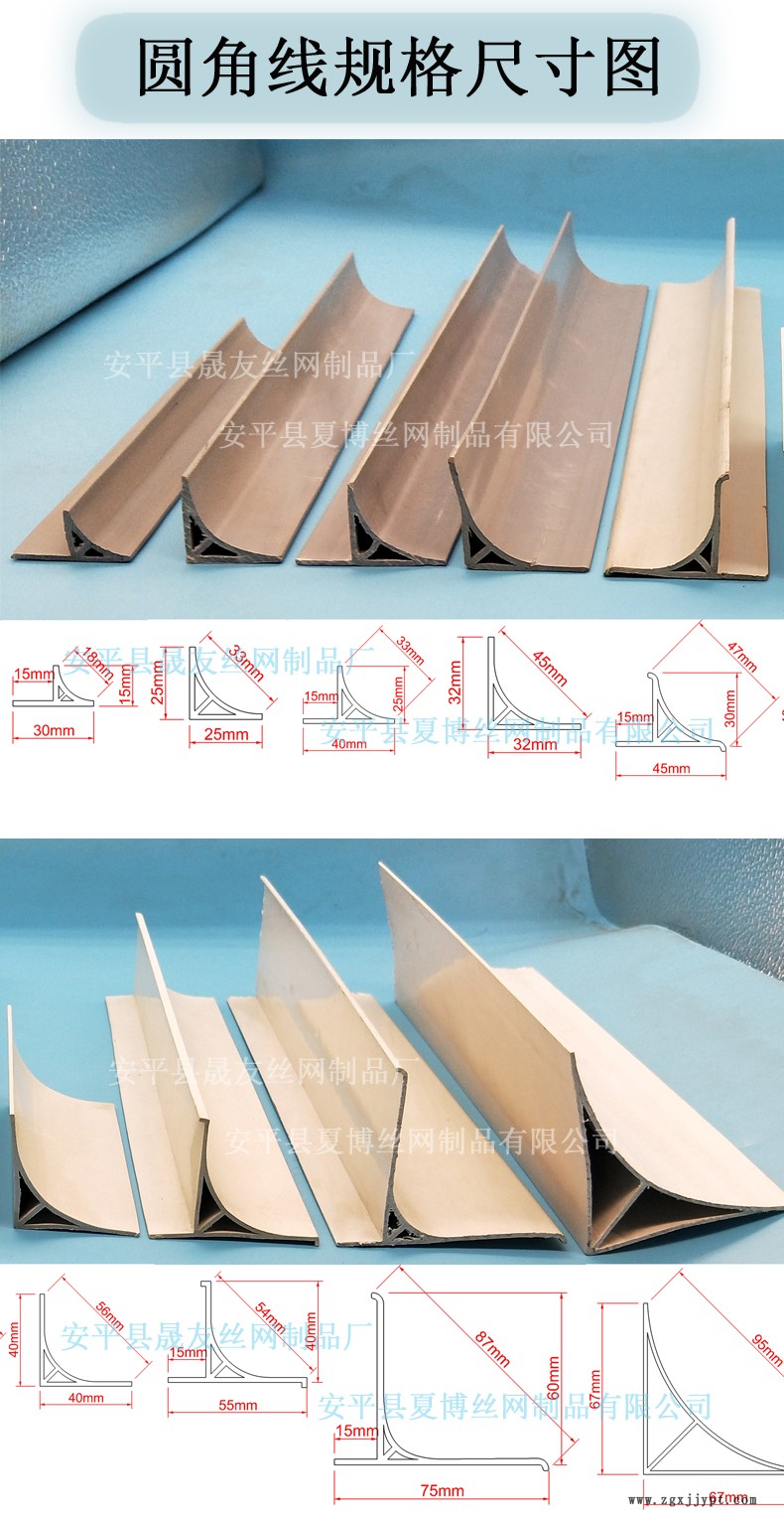 混凝土倒圓角線主要用于變電站、火電廠、學(xué)校、醫(yī)院、幼兒園、別墅、賓館、酒店、辦公樓等混凝土、磚混、石膏板等在做混凝土圓角造型模具的作用,外部用木模板固定。