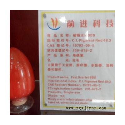 耐曬艷紅BBS-P:塑膠色母和粉末涂料專用(氣流分水,耐高溫230°,耐遷移,分散性好)。