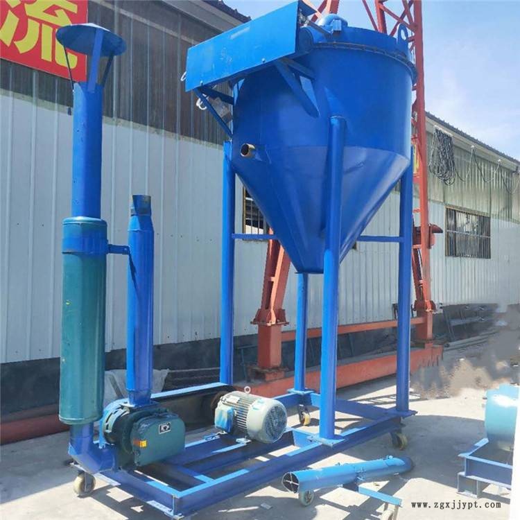 該機由核心(吸料)系統(tǒng)(羅茨風機、電機或柴油機、消聲筒、底座等);除塵系統(tǒng)(脈沖罐、爬梯、氣泵等);卸料系統(tǒng)(閉風卸料器或重力卸料器);支架系統(tǒng)(龍門支架);輸送系統(tǒng)(牛筋軟管、連接短管、卡箍等)和附件系統(tǒng)(吸料咀、伸縮布袋、料位開關等)等部分組成。