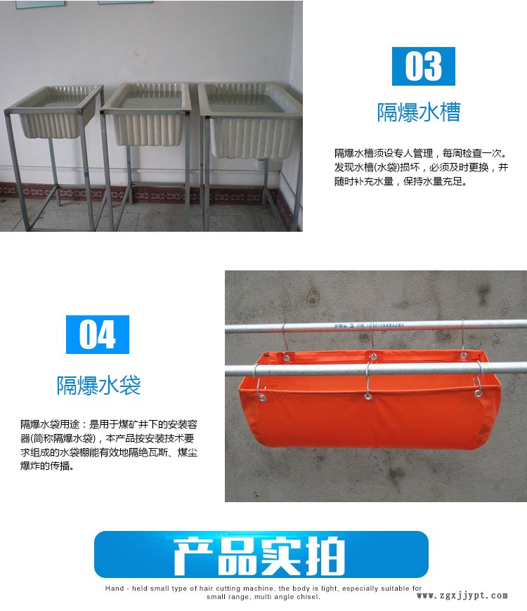 礦用隔爆水槽是用于煤礦井下的安裝容器,按安裝技術(shù)要求組成的水袋棚能有效地隔離瓦斯、煤塵爆炸的傳播;制作水袋的材料具有阻燃、防靜電等安全性能。