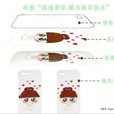 原理:彩印模內(nèi)轉(zhuǎn)印技術(shù)**是將東莞創(chuàng)時的模內(nèi)硅膠轉(zhuǎn)印膠片進(jìn)行彩印,然后在彩印的硅膠離型膠片上絲印硅膠專用抓色白底以增加耐刮耐磨效果,再將已印刷彩印離型膠片(冷撕熱撕、啞光亮光)放在模具內(nèi)固定,再將液體硅膠注入并加熱成型,然后通過硫化工藝,使離型膜片上的彩印圖案轉(zhuǎn)印在硅膠制品上,使產(chǎn)品達(dá)到裝飾與功能于一身的效果。硅膠表面印刷彩印技術(shù)突破了硅膠表面只能絲印,移印簡單圖案的局限;同時也突破了傳統(tǒng)的噴墨打印技術(shù),打印圖案精度低,圖案模糊,產(chǎn)品顏色不穩(wěn),產(chǎn)品不良率高,機(jī)器易壞,且維修成本高,無法批量生產(chǎn)等缺點(diǎn)。在凹凸不平的硅膠制品的表面制作出如同數(shù)碼照片一樣時尚高清精美的圖案。可廣泛用于硅膠啪啪圈手環(huán),硅膠啪啪圈手表,硅膠手環(huán),硅膠手表帶,硅膠手機(jī)套,游戲機(jī)套,硅膠U盤外套,硅膠筆套,硅膠繞線器,硅膠防滑墊,硅膠墊,酒吧墊,硅膠杯套,硅膠杯蓋,硅膠手套,、硅膠相框,硅膠商標(biāo)吊牌,硅膠鑰匙套,硅膠行李牌、硅膠手機(jī)吊飾,硅膠冰箱貼等硅膠制品的表面大量進(jìn)行精美圖案的生產(chǎn)。圖案耐磨耐刮,耐水耐酸堿,耐熱性良好可在高溫在長時間使用。