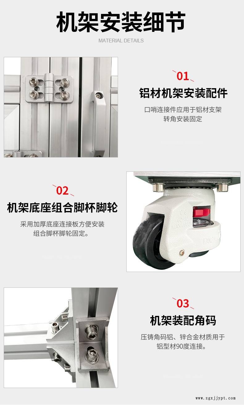 2、流水線工作臺、機械人工業(yè)圍欄、自動化設備框架選用鋁材系20/30/40/60/80等型材,規(guī)格齊全安裝配件供應,可提供整套設計方案,