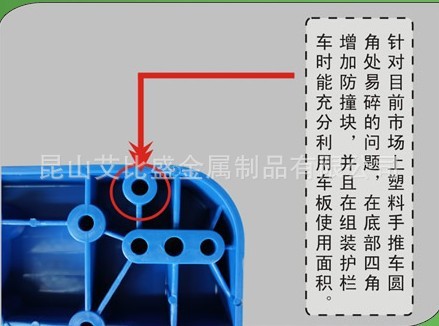 靜音手推車由塑料車板、粉體涂裝扶手(可折倒、固定)、靜音腳輪(尼龍支架、鐵板支架)等組成。