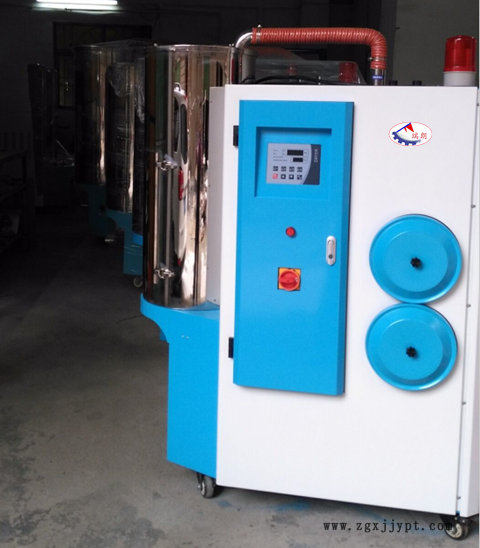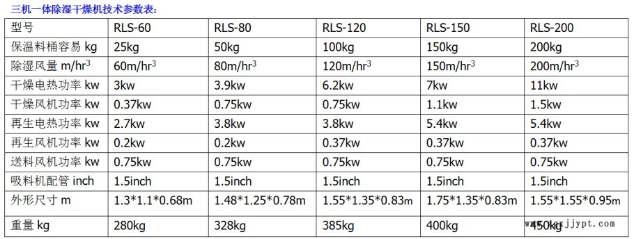 干燥除濕部分:從干燥料桶回來的濕熱空氣經(jīng)冷卻,吹入蜂巢轉(zhuǎn)輪??諝庵械乃直晦D(zhuǎn)輪吸附,然后又被再生加熱空氣所脫附。兩股氣流同時作用在轉(zhuǎn)輪上,并隨著轉(zhuǎn)輪的轉(zhuǎn)動,使得空氣中的水分連續(xù)不斷的被吸附又被再生空氣所脫附而排出,就形成穩(wěn)定的露點(diǎn)空氣,經(jīng)加熱到塑膠的干燥溫度,吹入干燥料桶內(nèi),形成密閉循環(huán),干燥原料。吸料部分:吸料是從儲料桶或其他儲料容器中吸入干燥料桶內(nèi),當(dāng)真空料斗的磁簧開關(guān)偵測到無料時,吸料馬達(dá)運(yùn)轉(zhuǎn),使真空料斗內(nèi)產(chǎn)生真空,儲料桶中的原料由于空氣的壓力差被吸入真空料斗內(nèi),當(dāng)吸料時間完成后,吸料馬達(dá)停止運(yùn)轉(zhuǎn),原料會因自重落入干燥料桶內(nèi)。經(jīng)干燥后的原料從干燥料桶抽到安裝在塑膠成型機(jī)的光電料斗或微動料斗內(nèi)。 轉(zhuǎn)輪除濕機(jī),一對三塑料除濕機(jī),轉(zhuǎn)輪塑料除濕機(jī)技術(shù)參數(shù)