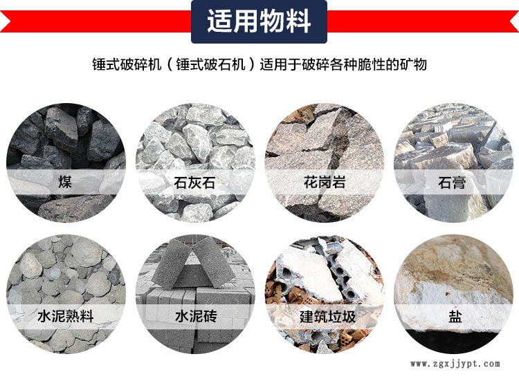適用物料:花崗巖、玄武巖、石灰?guī)r、河卵石、水泥熟料、石英石、鐵礦石、鋁礬土、建筑垃圾、鹽、磚瓦、煤等