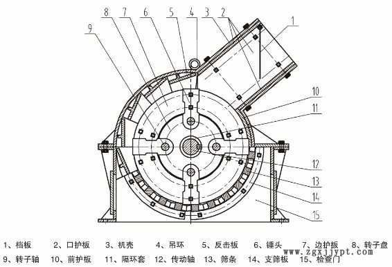 、粉碎物料中小于篩孔尺寸的粒級通過篩板排出,大于篩孔尺寸的粗粒級阻留在篩板上繼續(xù)受到錘子的打擊和研磨,然后通過篩板排出機外。