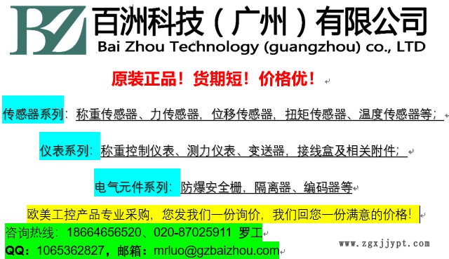 稱重/張力變送器和顯示儀表及放大器: PS1010; PS-1020; PS1010T;PS-1040; PS-1045; PS-1050; PS-121 ;PS-2010W; LCP-104; DXP-40;LCP-100; LCP-200; LCP-400; DXP-10/15; LCM-200; LCC-II; PS2010TPS 1020特點(diǎn)如下:特點(diǎn): 完善的負(fù)載單元信號調(diào)節(jié);10V激勵電源可提供給4個負(fù)載單元;可選0-5,0-10V或4-20mA模擬輸出;單獨(dú)的零位和滿幅調(diào)節(jié);標(biāo)準(zhǔn)導(dǎo)槽安裝;模擬濾波可調(diào)。應(yīng)用: 稱重;總量計(jì)量和控制;為面板儀表提供信號;模擬數(shù)據(jù)日志。詳情請致電020-87025911、QQ:1065362827