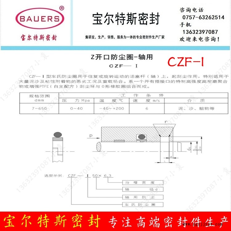 Z型開口防塵車氏軸用防塵圈CZF-I CZF-I型車氏防塵圈用于往復(fù)或旋轉(zhuǎn)運(yùn)動(dòng)的活塞桿(軸)上,起刮塵作用,特別適用于大量泥沙及粘性附著物的惡劣工況及重載場(chǎng)合。系一個(gè)有開搭接口的特制高強(qiáng)度高耐磨聚合物或增強(qiáng)PTFE(自主配方)刮塵環(huán)與O形橡膠圈組合而成。