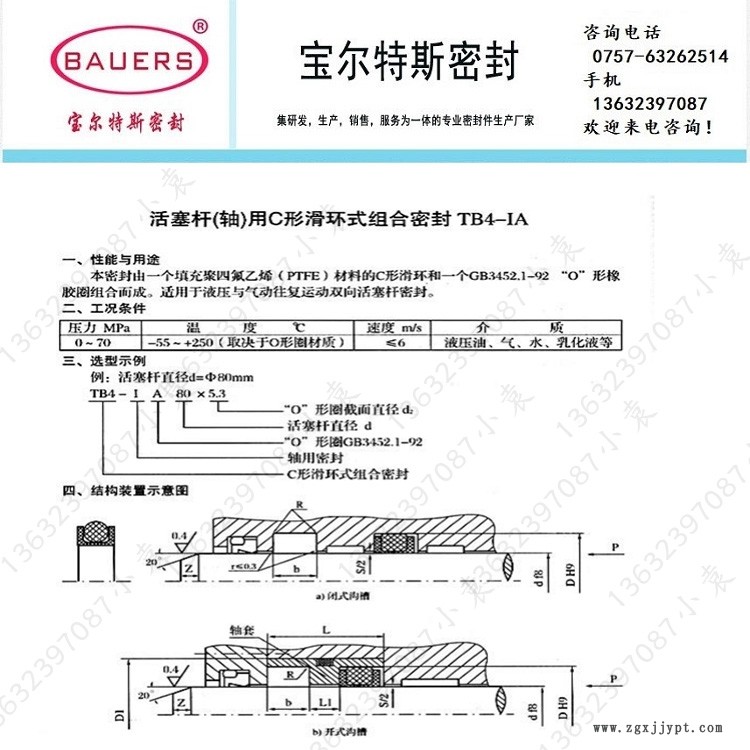 活塞桿(軸)用C形滑環(huán)式組合密封TB4-IA 車氏密封TB4-IA TB4-IA密封由一個填充聚四氟乙烯(PTFE)材料的C形滑環(huán)和一個 “O” 形橡膠圈組合而成。適用于液壓與氣動往復雙向活塞桿密封。按工作條件不同,可采用不同材質的O形橡膠圈及滑環(huán)。采用多組串聯(lián)或單組密封均可。壓力范圍:0~70Mpa溫度范圍:-55℃~+250℃(取決于O形圈材質)速 度:≤6m/s密封介質:液壓油、氣、水、水-乙二醇、礦物油、酸、堿、乳化液等。) 兩米以內均可加工定制?。o需模具 兩米以上請先與我司客服人員溝通確認 專注·專業(yè)做好密封 佛山寶爾特斯密封歡迎您來電咨詢?。?
