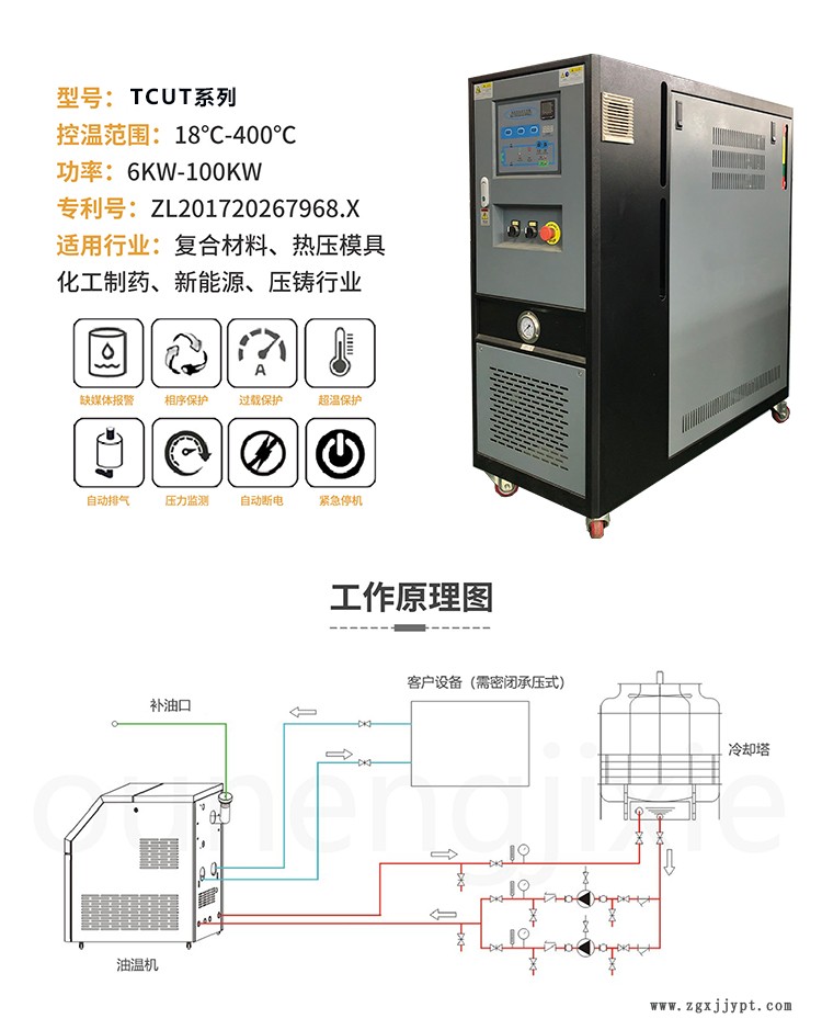 | 產(chǎn)品別名 : | 油溫機(jī) | 產(chǎn)品用途 : | 復(fù)合材料模壓控溫 ,注塑控溫,輥筒控溫 |
