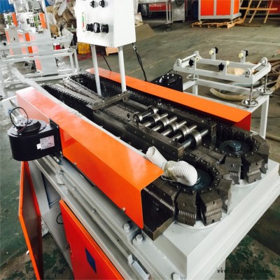 性能和優(yōu)點:特殊螺桿,解決了螺桿機筒易磨損及物料成形難的問題。模具的結(jié)構(gòu)設(shè)計合理,更換模具方便可靠。成型機采用軌道式運行結(jié)構(gòu),特殊設(shè)計的軌道軌跡讓每對模塊在成型通道中運行非常順暢且準確對位,使管材由于合模形成的合模線非常淺且不易看出有利于管材的美觀。冷卻方式模板串水冷卻及風(fēng)冷,冷卻水在成型機中循環(huán)快速流動,有效的加快了管材的冷卻速度,從而大大的提高了管材的生產(chǎn)速度。同時成型機基架采用積木式設(shè)計,積木式設(shè)計我們可以用相同的基架根據(jù)客戶的要求設(shè)計出不同長度的成型機,成型段越長生產(chǎn)速度越快產(chǎn)量越高,充分滿足不同客戶對成型機不同產(chǎn)量的要求。