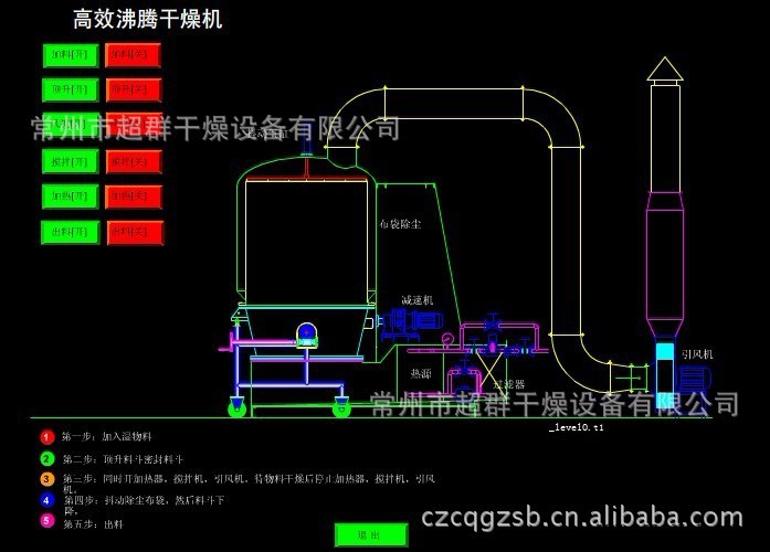 空氣經(jīng)加熱凈化后,由引風(fēng)機(jī)從下部導(dǎo)入,穿過料斗的孔網(wǎng)板.在工作室內(nèi),經(jīng)攪拌和負(fù)壓 作用形成流態(tài)化, 水份快速蒸發(fā)后隨著排氣帶走,物料快速干燥。