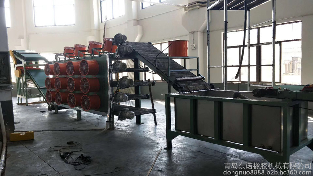 本膠片冷卻機(jī)與密煉機(jī)、開(kāi)煉機(jī)配套使用的。密煉機(jī)練好的塑煉膠、混煉膠,經(jīng)壓片機(jī)壓片后,通過(guò)環(huán)型丁晴帶將膠片攜帶至不銹鋼隔離劑冷卻槽。將膠片進(jìn)行浸泡、冷卻后,自動(dòng)將膠片送至掛膠冷卻區(qū)。對(duì)膠片進(jìn)行風(fēng)冷干燥后,自動(dòng)完成將膠片送至另一頭,然后進(jìn)行下片,風(fēng)箱采用環(huán)形結(jié)構(gòu), 程度節(jié)省直線空間。
