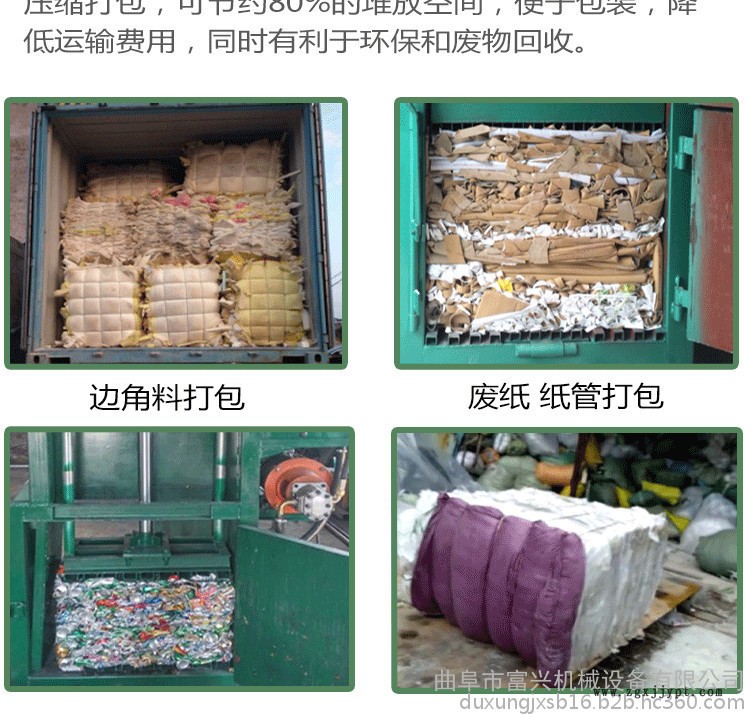 本機適用于對廢舊物料、廢紙、塑料等松散物的打包壓縮等大批量集中壓縮、打包處理,快速、簡便,是提高勞動效率,減輕勞動強度、節(jié)約人力、減少運輸費用的好設備。可根據(jù)客戶特殊要求定做不同規(guī)格非標類打包機。