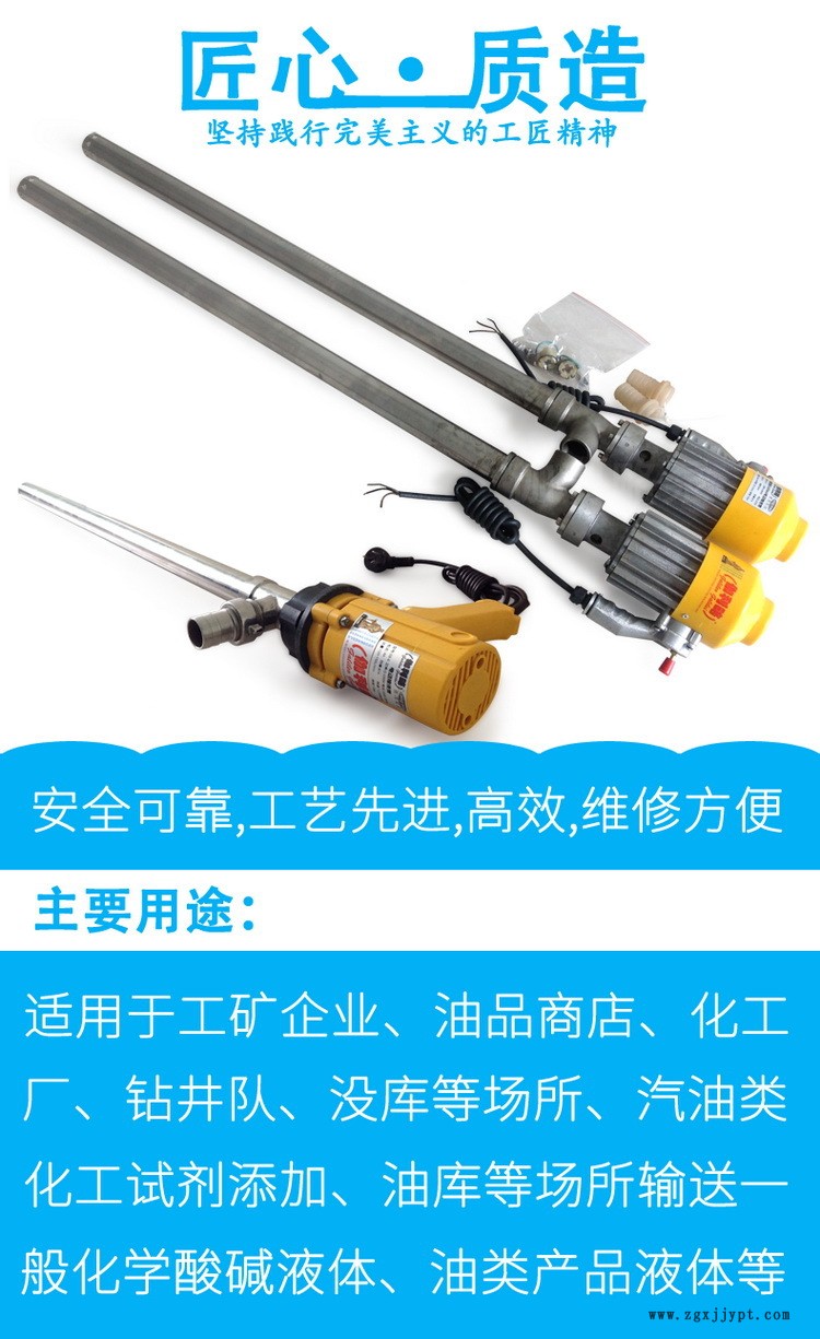 SB型電動(dòng)油桶泵(插桶泵、抽液泵)適用于工礦企業(yè)、油品商店、化工試劑添加、油庫(kù)等場(chǎng)所輸送一般化學(xué)酸堿液體、油類(lèi)產(chǎn)品液體等。該泵外形美觀、重量輕、操作簡(jiǎn)單廣受用戶好評(píng),是替代進(jìn)口同規(guī)格電動(dòng)油桶泵的理想產(chǎn)品。