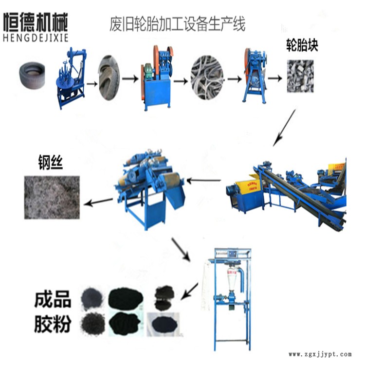 廢舊輪胎粉碎機(jī)是一款處理廢舊輪胎、貨車輪胎、鋼絲輪胎等原材料進(jìn)行破碎,將鋼絲和橡膠分離,終得到5-60目左右的膠?;蚰z粉,是鋼絲胎膠粉生產(chǎn)專用的破碎設(shè)備。廢舊輪胎粉碎機(jī)由廢舊鋼絲輪胎切圈口機(jī)、切條機(jī)、切塊機(jī)、800輥筒磨粉機(jī)、雙磁選機(jī)、旋風(fēng)上料機(jī)、篩選機(jī)、單磁選機(jī)這幾部分組成。