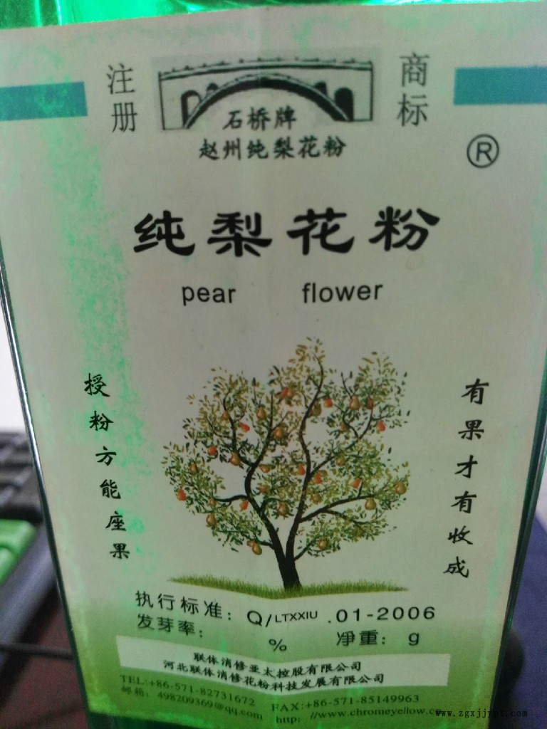 誠(chéng)實(shí)做人,專心做事。在借鑒日本技術(shù)和設(shè)備的基礎(chǔ)上,經(jīng)十幾年潛心研究,我廠終于成功開(kāi)發(fā)出人工授粉用果樹(shù)花粉工廠化、大批量、高品質(zhì)加工工藝,徹底解決了人工授粉用果樹(shù)花粉產(chǎn)量低、成本高、品質(zhì)差、不耐貯運(yùn)等缺點(diǎn),產(chǎn)品年年出口日本、韓國(guó)、臺(tái)灣等**和地區(qū),其卓越的品質(zhì)受到了廣大果農(nóng)的極大好評(píng)?!安慌虏蛔R(shí)貨,**怕貨比貨”。樣品備索,常年免費(fèi)提供! ??一、生產(chǎn)商:河北趙州林業(yè)基地 ??地 址:河北石家莊趙州林果經(jīng)濟(jì)開(kāi)發(fā) ??梨花粉 雪梨花 鴨梨花粉 ??二、用途:人工授粉用 化妝品 ??三、花粉品種:雪梨 ??四、純度:精細(xì)純花粉,不含任何人工添加劑,純度96%。 ??五、品質(zhì):發(fā)芽率85%以上 ??六|、供貨時(shí)間:全年供貨。 ??七、選用雪梨做授粉品種的優(yōu)點(diǎn): ??經(jīng)過(guò)日本果樹(shù)專家的長(zhǎng)期對(duì)比試驗(yàn),發(fā)現(xiàn)雪梨作為授粉品種具有以下優(yōu)點(diǎn): ??1、花粉生命力旺盛,花粉管生長(zhǎng)迅速、強(qiáng)壯、授粉力高,在相同的試驗(yàn)條件下,雪花梨的萌芽力和花粉管的長(zhǎng)度明顯地比其他品種高出20%左右,所以可以很好地保證果樹(shù)的授粉受精,提高果樹(shù)的座果率。 ??2、雪梨的果形大、品質(zhì)好,可以增大授粉品種的果個(gè),提高果實(shí)的商品價(jià)值。 ??3、雪梨果型端正無(wú)畸形果,果皮光滑果點(diǎn)小,可以明顯提高果實(shí)的外觀品質(zhì)。 ??4、雪梨果肉細(xì)膩果核小,糖度高石細(xì)胞少,可明顯提升授粉品種的內(nèi)在品質(zhì)。 ??八、使用“石橋”牌花粉的好處: ??1、使用“石橋”牌花粉比果農(nóng)自制花粉成本更低,更劃算?!笆瘶颉迸苹ǚ酃芾砜茖W(xué),產(chǎn)量大,成本低,售價(jià)也很低。而果農(nóng)自制花粉雖然用量不大,但仍需花費(fèi)很多功夫和精力采花、采藥、篩選、烘干等過(guò)程,制造1g花粉,綜合成本很高,很不劃算。 ??2、工藝先進(jìn)品**良,“石橋”牌花粉系采用目前國(guó)際**先進(jìn)的加工工藝精制而成,所以品**良,發(fā)芽率高,當(dāng)年新花粉發(fā)芽率可達(dá)90%以上,而果農(nóng)自制花粉,由于方法不科學(xué),發(fā)芽率非常低,有庶幾年國(guó)內(nèi)外客戶的使用結(jié)果證明,1g“石橋”牌花粉至少比果農(nóng)自制的4g花粉好用,并且品質(zhì)穩(wěn)定**無(wú)風(fēng)險(xiǎn)。 ??3、信譽(yù)良好純度高。秉持“誠(chéng)實(shí)做人,專心做事”的原則“石橋”牌花粉在生產(chǎn)加工過(guò)程中,絕不添加任何添加劑,保證花粉純度在9粉加工出口經(jīng)驗(yàn)和對(duì)技術(shù)的精益求精,使“石橋”牌花粉不論在什么樣的年份,都可以保持永恒的品質(zhì)而可以按時(shí)、按質(zhì)、按量給客戶提供**好的產(chǎn)品。 ??5、包裝合理耐貯運(yùn)。“石橋”牌花粉包裝合理,貯運(yùn)科學(xué),所以可以很好地保持花粉品質(zhì),**大限度延長(zhǎng)花粉的使用期限。 ??6、使用簡(jiǎn)單,方法多樣?!笆瘶颉迸苹ǚ凼褂梅椒ê?jiǎn)單易學(xué),多種多樣,既可人工點(diǎn)授,又可以噴粉或噴霧。省工、省時(shí)、省力。 ??九、“石橋”牌花粉使用注意事項(xiàng) ??1、貯運(yùn)時(shí),避免高溫和陽(yáng)光直射,防止受潮。長(zhǎng)期不用時(shí)應(yīng)放置在0-5℃的環(huán)境下。 ??2、使用時(shí),應(yīng)先將花粉攤放在陰暗潮濕的環(huán)境中24小時(shí)以上充分吸濕。 ??3、必須現(xiàn)配現(xiàn)用。 ??4、遇到氣候惡劣的天氣,要多授1-2遍,以保證授粉充分。對(duì)花器會(huì)造成嚴(yán)重傷害的氣候條件,如霜凍,要注意提前預(yù)防。如花器受到損害,質(zhì)量再好的花粉也沒(méi)用。 ??5、梨以授先開(kāi)的邊花為主。 ??6、授粉果園,如能疏花和疏果,效果會(huì)更佳。 我廠在借鑒日本技術(shù)和設(shè)備的基礎(chǔ)上,經(jīng)多年潛心研究,現(xiàn)已成功開(kāi)發(fā)出果樹(shù)人工授粉用花粉工廠化大批量高品質(zhì)加工工藝,徹底解決了果樹(shù)花粉生產(chǎn)中產(chǎn)量低,成本高,品質(zhì)差,不耐貯運(yùn)等缺點(diǎn),為果樹(shù)人工授粉技術(shù)的大面積推廣普及打下了堅(jiān)實(shí)的基礎(chǔ),我廠可全年為你提供以下“石橋”牌花粉: 1梨花粉,品種為雪梨, 2蘋果花粉,品種為金帥秦冠. 3桃花份,品種為大九保. 4另有李子**桃柚子等花粉,需提前預(yù)定. 農(nóng)歷三月初,趙縣的梨花**要開(kāi)了,果農(nóng)都會(huì)到梨園里面疏梨花,歡迎各地做梨花粉的廠家和朋友到這里來(lái)收購(gòu). 我可為你們供貨或代收.