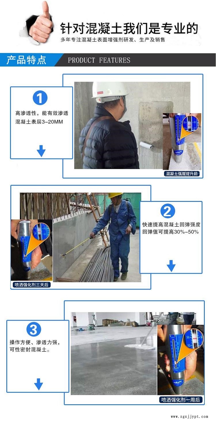 (1)通過有效滲透,本產(chǎn)品與水氣及混凝土中的化合物成分發(fā)生化學(xué)反應(yīng),使混凝土硬度提高,使混凝土可以呼吸,有效提高混凝土硬度、密度、抗壓強(qiáng)度,回彈強(qiáng)度可提高40%~60%。(進(jìn)口型)