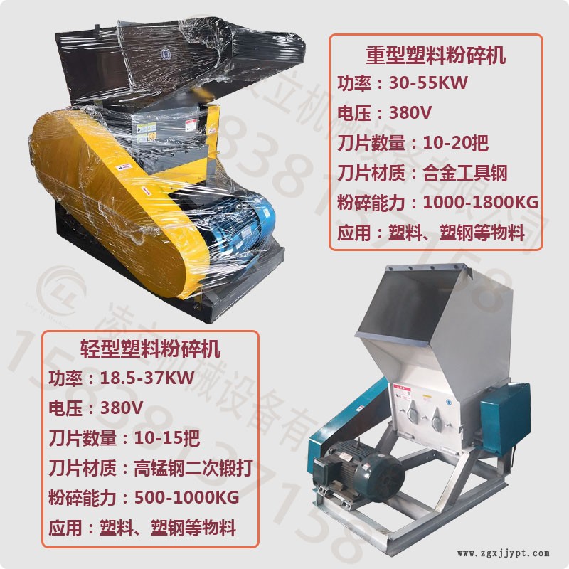 塑料粉碎機(jī)主要用于粉碎熱塑性塑料和橡膠制品等,如塑料異型材、管、棒、絲線、薄膜、廢舊橡膠制品。粒料可直接供擠出、注塑之用。具有破碎能力大,產(chǎn)量高,工作性能穩(wěn)定等特點(diǎn),可根據(jù)用戶需要配置不同機(jī)型,大口徑重型粉碎機(jī)可用于破碎大型塑料中空容器,大塊機(jī)頭料、板材料等。