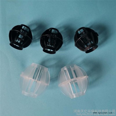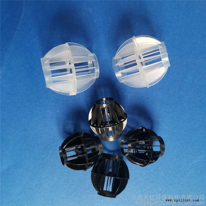 采用聚丙烯(PP)塑料制成球狀,由兩個(gè)半球合成一個(gè)球形,每個(gè)半球上根據(jù)設(shè)計(jì)需要有8-12個(gè)半扇形葉片,兩個(gè)半球的扇形葉片相互錯(cuò)開。該填料特點(diǎn)是比表面積大,空隙率較高。但是由于葉片數(shù)偏多,彼此間有遮蔽效應(yīng),不利于液體分布和潤(rùn)濕;液體大多在球體空心柱匯集,阻礙氣體流通,因此阻力較大。