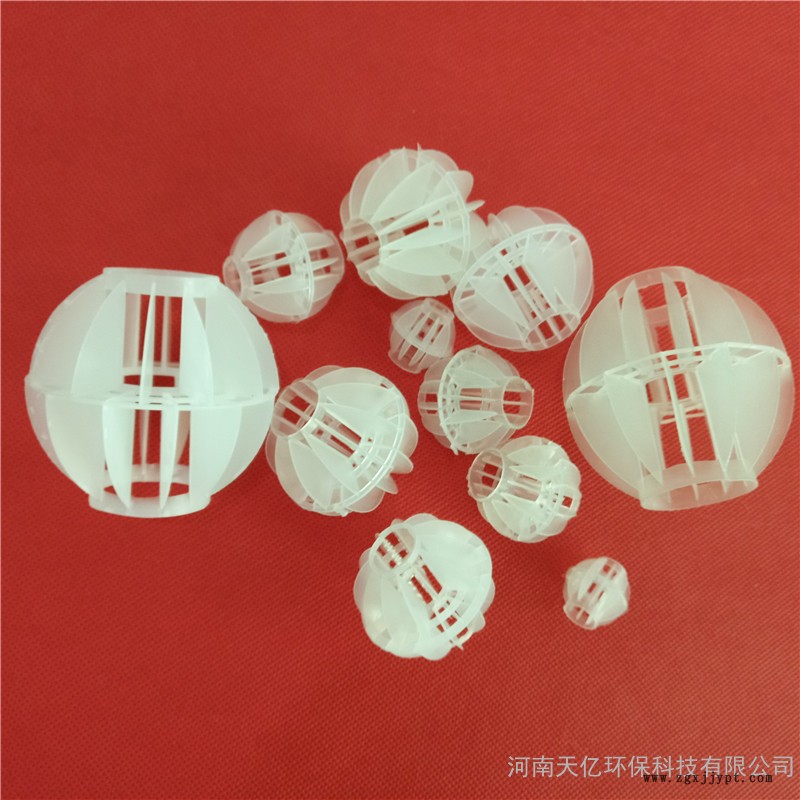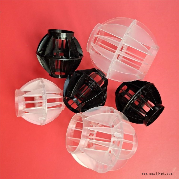 采用聚丙烯(PP)塑料制成球狀,由兩個半球合成一個球形,每個半球上根據(jù)設(shè)計需要有8-12個半扇形葉片,兩個半球的扇形葉片相互錯開。該填料特點(diǎn)是比表面積大,空隙率較高。但是由于葉片數(shù)偏多,彼此間有遮蔽效應(yīng),不利于液體分布和潤濕;液體大多在球體空心柱匯集,阻礙氣體流通,因此阻力較大。