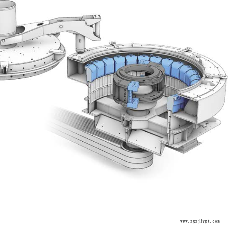 石料從破碎機(jī)上面直接進(jìn)入到轉(zhuǎn)子中心,分布在離心轉(zhuǎn)子室里。石料在轉(zhuǎn)