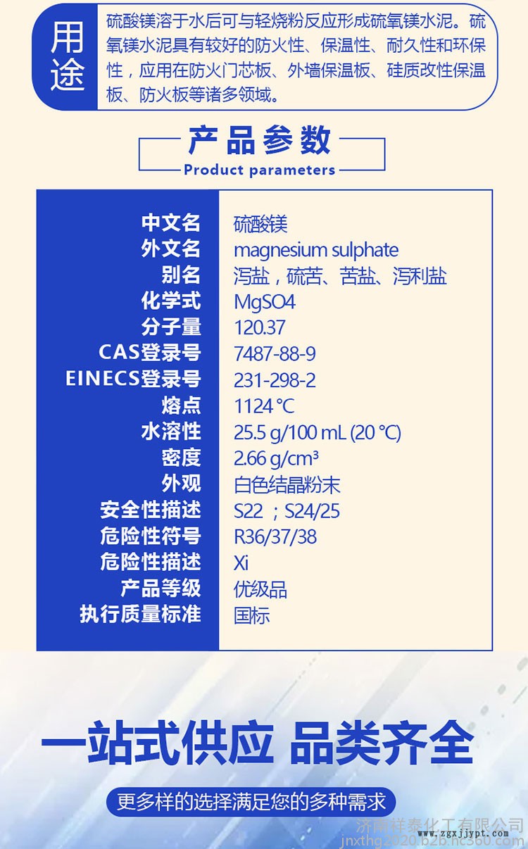 硫酸鎂溶于水后可與輕燒粉反應(yīng)形成硫氧鎂水泥。硫氧鎂水泥具有較好的防火性、保溫性、耐久性和環(huán)保性,應(yīng)用在防火門(mén)芯板、外墻保溫板、硅質(zhì)改性保溫板、防火板等諸多領(lǐng)域。
