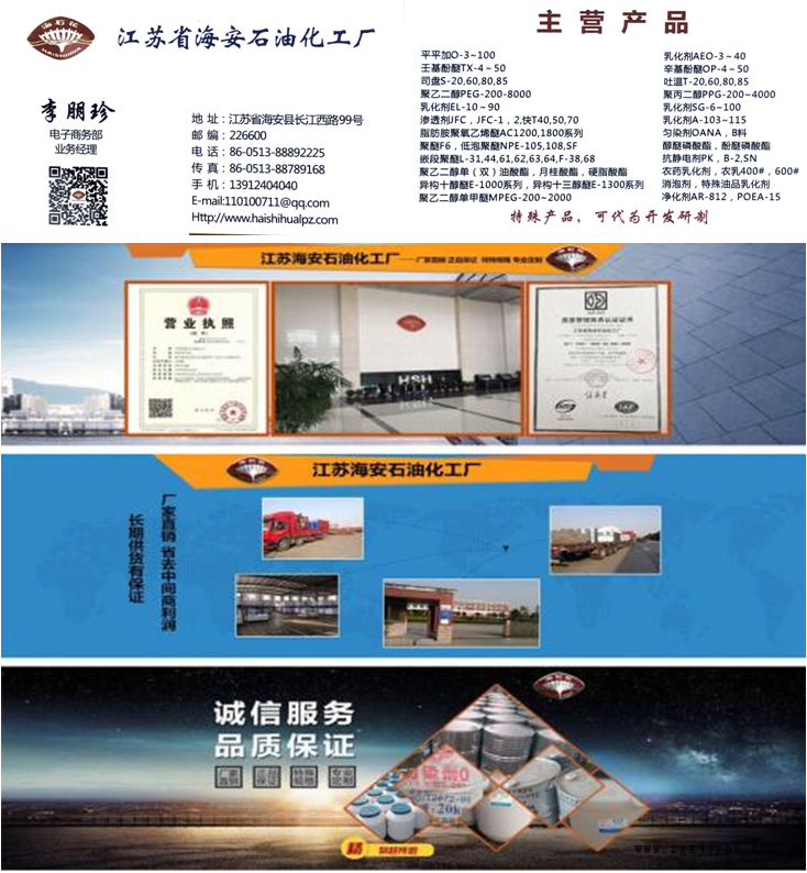企業(yè)簡介】?江蘇省海安石油化工廠是生產(chǎn)表面活性的專業(yè)廠家,主要產(chǎn)品有勻染劑,乳化劑,滲透劑,凈洗劑,消泡劑,抗靜電劑,聚乙(丙)二醇,脂肪醇聚醚,脂肪胺聚醚,烯丙基聚醚,聚乙二醇油酸酯,月桂酸酯,硬脂酸酯,磷酸酯, 酯,司盤,吐溫,聚乙二醇單 ,油酸二乙醇酰胺,防老劑,平平加,乳化劑OP4SA,E-1310SA,乳化劑OS,乳化劑O/MOA/OP/EL/SG/400MO/600MO/400DL,農(nóng)乳600#,石蠟乳化劑,白油乳化劑,植物油乳化劑,單甘酯(食品級),滲透劑JFC,快T,RP-98,AEP,OEP-70,低泡滲透劑SF,聚乙二醇PEG,聚丙二醇PPG,聚醚F6,消泡王,消泡劑GP330,聚醚L35,44,61,62,64,,68,無規(guī)聚醚,抗靜電劑SN,MOA3PK,B-2,凈洗劑6501,POEA-15,蓖麻油磷酸酯,MOA3P,MOA9P,E-1310P,OPP-10等。