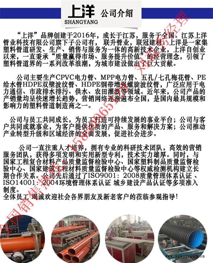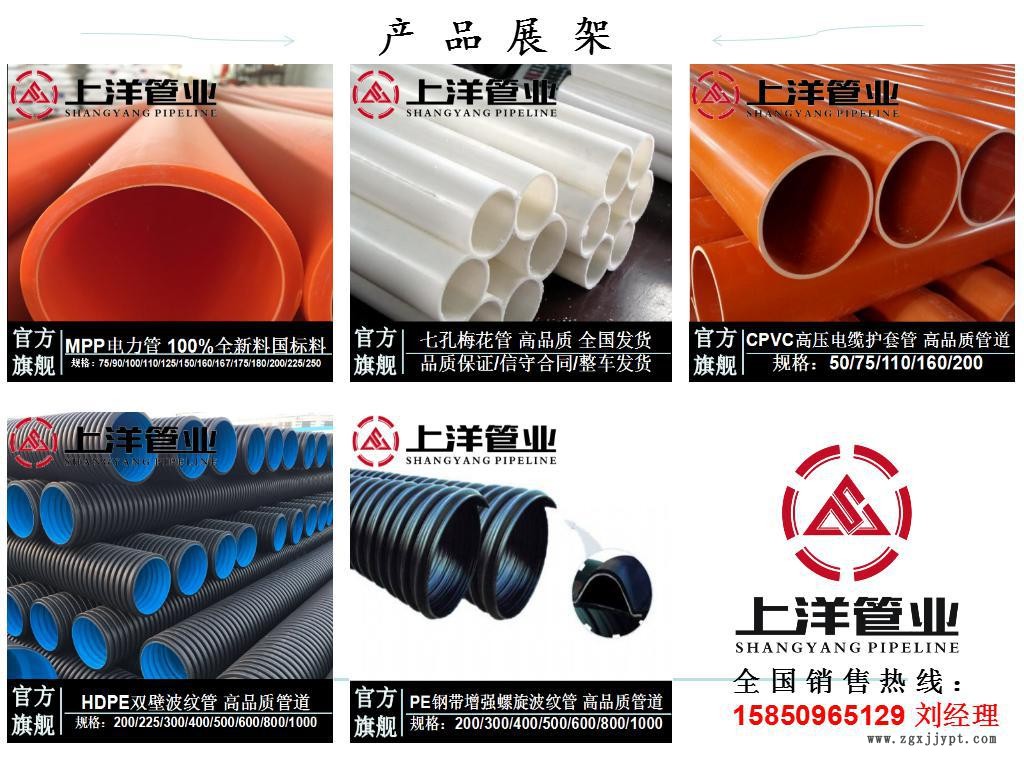 上洋管業(yè)專業(yè)生產(chǎn)CPVC高壓電力管、MPP電力管、HDPE雙壁波紋管、鋼帶增強(qiáng)PE螺旋波紋管、七孔梅花管、PVC排水管、檢查井。海量庫(kù)存,整車全國(guó)發(fā)貨。先后引進(jìn)成套先進(jìn)的生產(chǎn)線數(shù)十條,擁有雄厚的技術(shù)力量和完善的檢測(cè)設(shè)備。憑借多年來(lái)積累的生產(chǎn)和管理經(jīng)驗(yàn)結(jié)合不斷的技術(shù)創(chuàng)新,生產(chǎn)的塑料管材管件廣泛用于城市電力管道、排污管道系統(tǒng)。