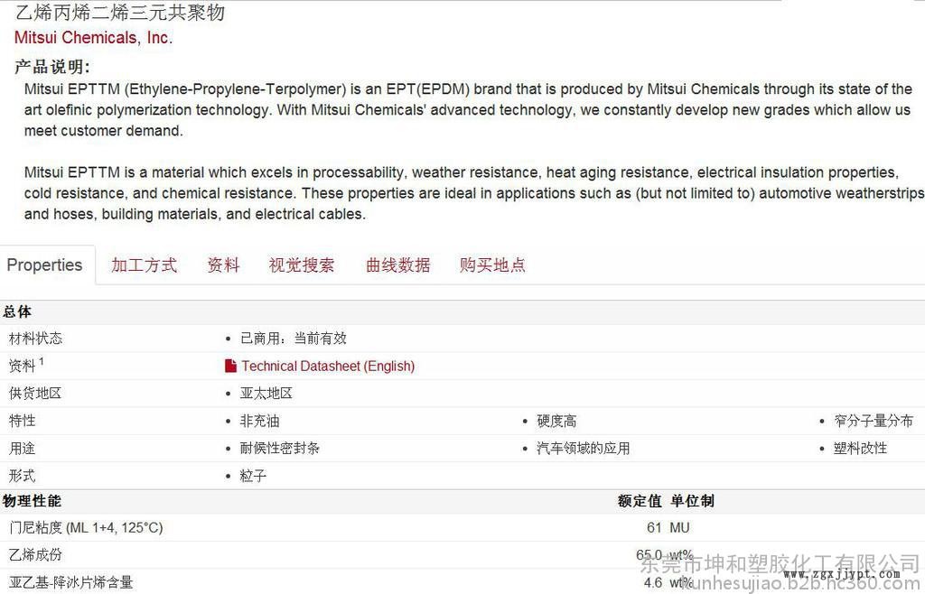 三元乙丙是乙烯、丙烯和非共軛二烯烴的三元共聚物。二烯烴具有特殊的結構,只有兩鍵之一的才能共聚,不飽和的雙鍵主要是作為交鏈處。另一個不飽和的不會成為聚合物主鏈,只會成為邊側鏈。三元乙丙的主要聚合物鏈是完全飽和的。這個特性使得三元乙丙可以抵抗熱,光,氧氣,尤其是臭氧。三元乙丙本質(zhì)上是無極性的,對極性溶液和化學物具有抗性,吸水率低,具有良好的絕緣特性。
