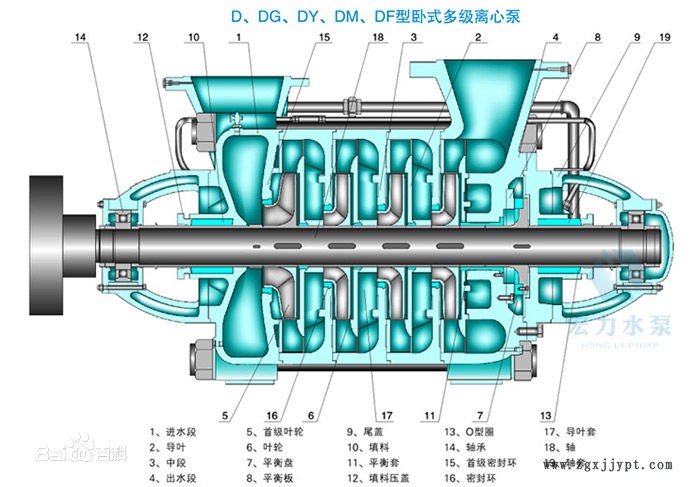 D、DF、DY、MD型泵系臥式、單吸、分段式多級(jí)離心泵,吸入口為水平方向,吐出口為垂直向上。泵的進(jìn)水段、中段、出水段等泵殼體部分通過拉緊螺栓聯(lián)接成一體,并根據(jù)泵的揚(yáng)程選擇泵的級(jí)數(shù)。