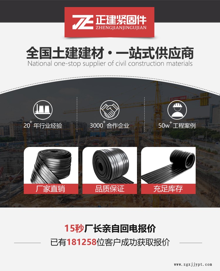 橡膠止水帶和止水橡皮系以天然橡膠與各種合成橡膠為主要原料,摻加各種助劑及填充料,經(jīng)塑煉、混煉、壓制成型,其品種規(guī)格較多,有橋型、山型、P型、U型、Z型、乙型、T型、H型、E型、Q型等。以天然橡膠或各種合成橡膠為主要原料,摻入多種助劑和填充料,經(jīng)塑化、混煉、壓延和硫化等工序制成。根據(jù)使用情況又可分類為埋式橡膠止水帶和背貼式橡膠止水帶。該止水材料具有良好的彈性,耐磨性、耐老化性和抗撕裂性能,適應(yīng)變形能力強(qiáng)、防水性能好,溫度使用范圍為-45℃-+60℃.當(dāng)溫度超過70℃,以及橡膠止水帶受強(qiáng)烈的氧化作用或受油類等有機(jī)溶劑侵蝕時,均不得使用橡膠止水帶。一般常在地下室外墻和后澆帶施工時使用。