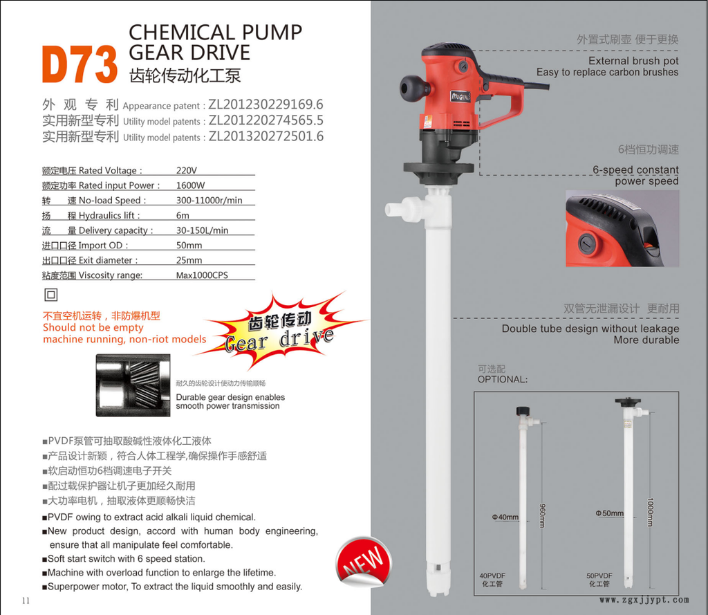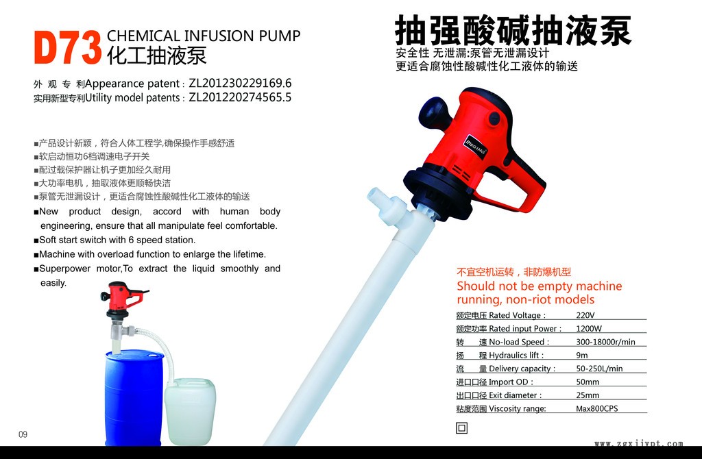 牧格D73/1200W化工泵為輕便型管式軸流泵,具有效率高,使用、維修方便等特點(diǎn)。此插桶泵(油桶泵,電動抽液泵)可以直接插入物料桶(適用于符合GB/325-1991標(biāo)準(zhǔn)的鋼桶)中抽取桶中非易燃易爆的化工液體,用途和特點(diǎn):