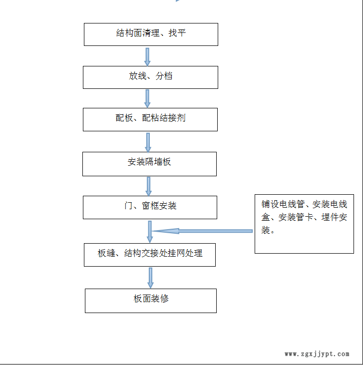 ??(1)輕質(zhì)隔墻板安裝,墻板干透后才能進(jìn)行表面抺灰和接縫處理。(防局部沉降,以先主體工程,其他砌體外墻工程,墻板抺灰工程,最后作輕質(zhì)隔墻面裝飾裝潢的順序)