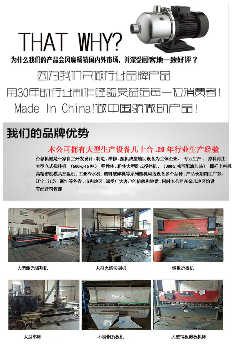 1.該系列機器占地小,耗能低,操控方便,省時省力,混 合效果快捷均勻,采用螺旋攪拌上料,投料方便,工人直接站于地面投料(也可以利用風機從切粒機把塑膠顆粒直接送入桶內(nèi))