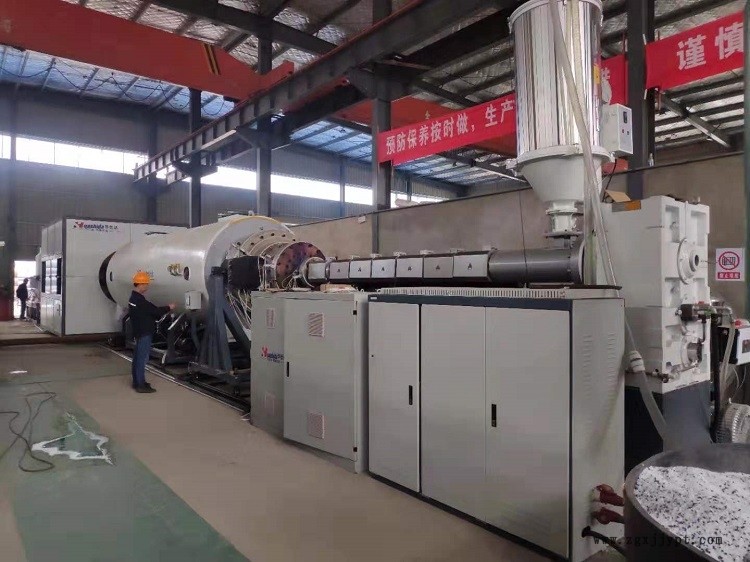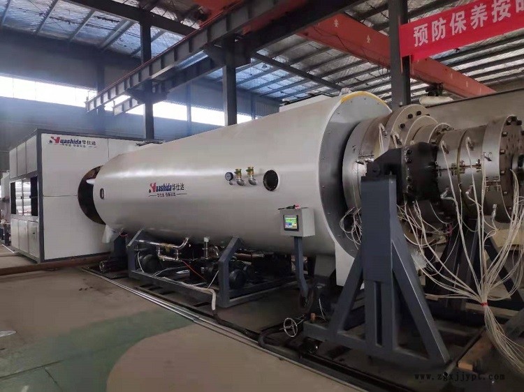 這次是一項(xiàng)新工程,標(biāo)準(zhǔn)要求更高更嚴(yán),需要生產(chǎn)的是Φ1054mm的保溫管材,單邊壁厚必須達(dá)到14mm。當(dāng)1380型保溫管設(shè)備到達(dá)鄭州的豫安公司不久,華仕達(dá)就派出羅增輝工程師前往調(diào)試。經(jīng)過幾天對(duì)設(shè)備的重新組裝,接通水電氣后,投料運(yùn)行、物料擠出、引管牽引直到無屑切割,都十分平順。因?yàn)槭切略O(shè)備,開機(jī)功率只占60%,一個(gè)小時(shí)剛好能拉一根重500多公斤、長(zhǎng)12米的Φ1054mm管材。整個(gè)設(shè)備只要有一人負(fù)責(zé)運(yùn)料,一人負(fù)責(zé)吊運(yùn)已經(jīng)切割好的管材,即一頭一尾有二個(gè)人就可以完成整個(gè)設(shè)備的生產(chǎn)操作,中間完全是流水線作業(yè),因此設(shè)備的自動(dòng)化 程度是相當(dāng)高的。