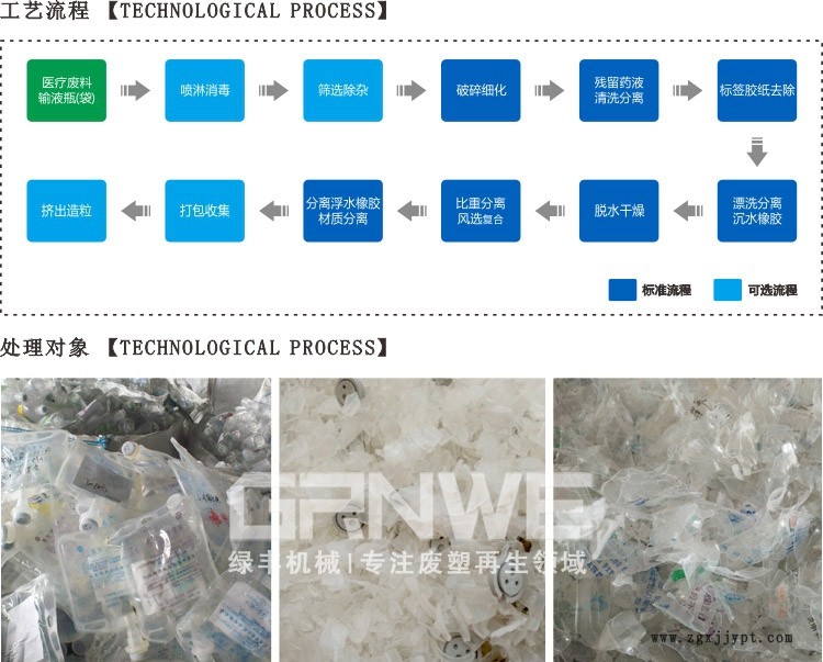 一次性塑料輸液瓶(袋)回收加工生產(chǎn)線主要用于醫(yī)用可回收塑料(輸液瓶/輸液袋)的回收分類、清洗加工、再生造粒等的加工處理。醫(yī)用可回收塑料是指:未被病人血液、體液、排泄物污染的一次性塑料器具(包含塑料輸液袋、輸液瓶類,但不包括輸液管及注射器等)。本生產(chǎn)線主要分為:1、原料預(yù)選及粉碎,2、殘液及污漬收集,3、清洗脫水,4、材質(zhì)分選,共四步工序,全套生產(chǎn)線自動(dòng)化程度高,一個(gè)投料入口和三個(gè)成品出口(三種不同材質(zhì)的成品出口),除入口及出口處需要人工投料和裝袋外,生產(chǎn)加工環(huán)節(jié)0人工介入。生產(chǎn)線全密封防水設(shè)計(jì),殘液收集和清洗環(huán)節(jié)均采用獨(dú)立的管道收集口,可直接與后端相應(yīng)的污水循環(huán)處理設(shè)備管口對(duì)接,以大限度的確保生產(chǎn)作業(yè)現(xiàn)場(chǎng)環(huán)境干凈、整潔(應(yīng)對(duì)企業(yè)整體項(xiàng)目的環(huán)評(píng)審批等行政手續(xù)有明顯優(yōu)勢(shì))。
