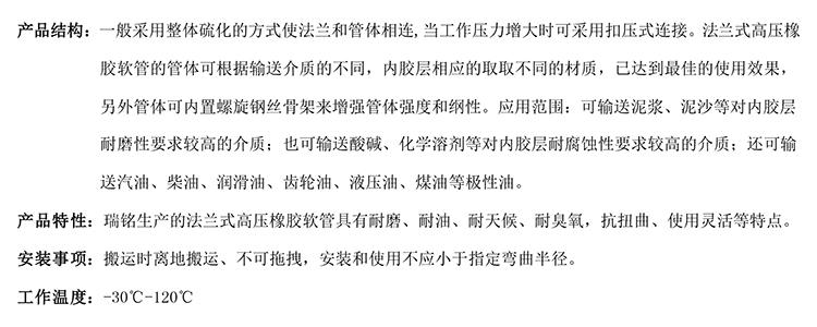 產(chǎn)品特性:瑞銘生產(chǎn)的法蘭式高壓橡膠軟管具有耐磨、耐油、耐天候、耐臭氧,抗扭曲、使用靈活等特點(diǎn)。