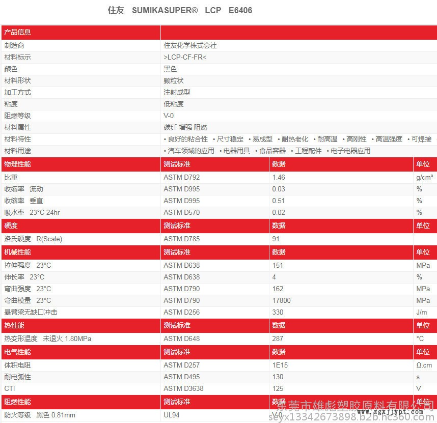 日本住友化學(xué) LCP E6406 增強(qiáng) 阻燃 尺寸穩(wěn)定性好 導(dǎo)電 低粘度 高剛性 高溫強(qiáng)度 可焊接 好的成型性能 好粘結(jié)性 ... 電氣/電子應(yīng)用領(lǐng)域; 電器用具; 工程配件; 汽車領(lǐng)域的應(yīng)用; 食品容器...