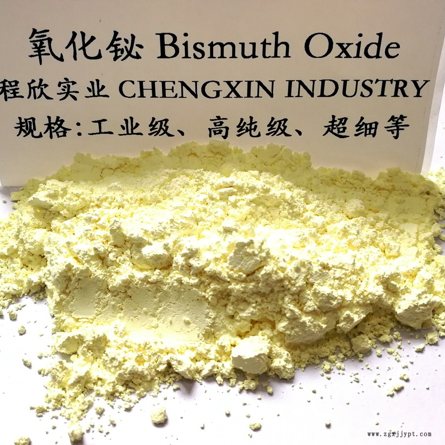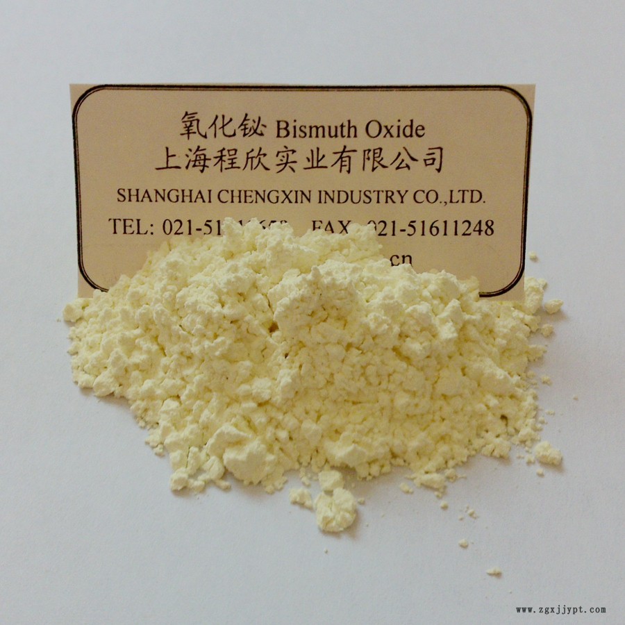 三氧化二鉍純品有α型和β型。α型為黃色單斜晶系結(jié)晶,相對密度8.9,熔點825 ℃,溶于酸,不溶于水和堿。β型為亮黃色至橙色,正方晶系,相對密度8.55,熔點860 ℃,溶于酸,不溶于水。容易被氫氣、烴類等還原為金屬鉍