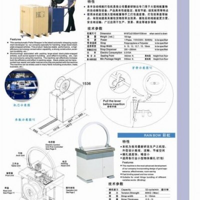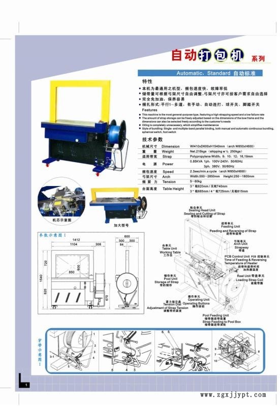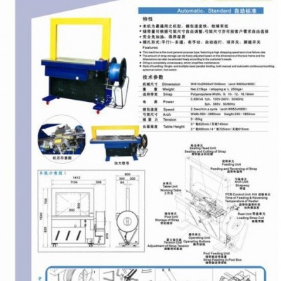品名:全自動打包機 型號:T150(自動標準高臺) 產品說明: 全自動打包機以PP帶為主要捆扎材料,廣泛應用于家電、食品、百貨、醫(yī)藥、化工、印刷、紡織等工商業(yè)、物流行業(yè)。本機可配套生動流水線使用,該機工作時可自動完成捆緊、切斷、粘合、出帶等過程,方便,實用。 主要特點: 1、電機+減速機+凸輪運作,完全免加油,捆包結束電機馬上停止運轉( 2 、緊縮力強不打滑,齒形結構粘合,高強度切割刀,性能好,壽命長 3.、機芯及控制體殼為整體壓鑄成型的鋁美合金 4、且零部件均由電腦數(shù)控機床精密制作,機械運作柔和、耐久性桌越、功能完善 5、松緊和儲帶均可自行調節(jié) 6.、尤其配合使用優(yōu)質帶成本可降低30-50% 技術參數(shù)