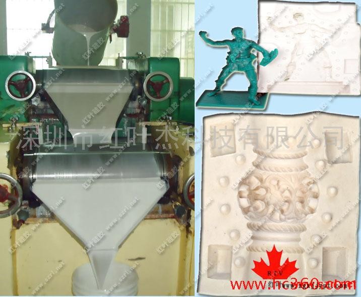 模具硅膠操作: 包模操作方法: 模具硅膠是流動(dòng)的白色液體,分兩二組:A組是硅膠,B是固化劑,例如100克硅膠加入2%固化劑攪拌均勻,倒入圍好的模種里面,放到抽空機(jī)進(jìn)行抽真空,抽完真空讓模具硅膠自然固化.